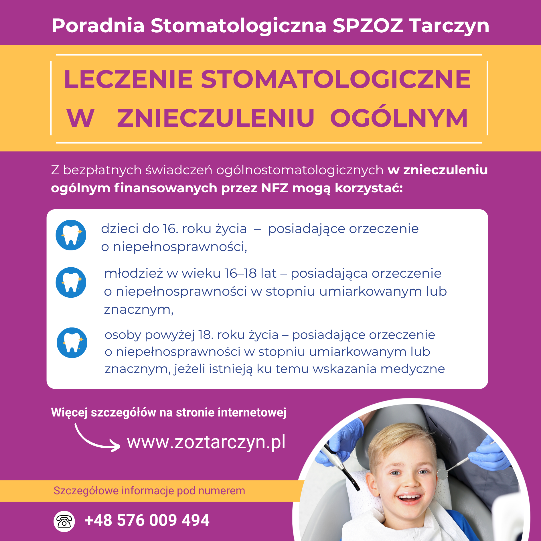 Samodzielny Publiczny Ośrodek Zdrowia w Tarczynie – realizuje kontrakt z Narodowym Funduszem Zdrowia na: ŚWIADCZENIA OGÓLNOSTOMATOLOGICZNE ZNIECZULENIU OGÓLNYM PROWADZONE W TARCZYNIE